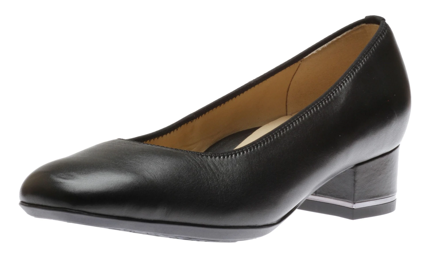 This elegant low heel pump features a smooth leather upper with a slightly squared toe for comfort. Inside, a soft leather lining and footbed ensure comfort and support. A synthetic rubber outsole delivers secure traction. A 1.4 inch block heel features a metallic trim for enhanced style.