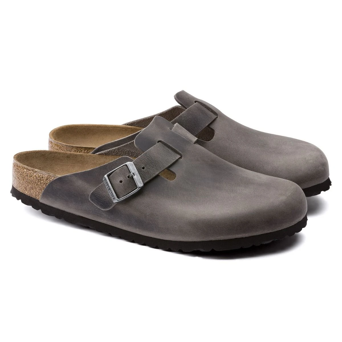 The Boston has a legendary status thanks to its sophisticated, individual design. With its additional foam layer, the soft footbed offers extra comfort and pampers feet – all day long. The Boston clog in iron is also made from extra thick, oiled nubuck leather with an open-selvage finish. Oiled leather means the clog has an untreated surface. Birkenstock purposely does not treat surface grains of its shoes. The Boston clog also features an adjustable strap with a metal buckle closure for a custom fit. The natural cork-and-latex footbed provides Birkenstock’s signature level of comfort and support. An EVA sole delivers cushioning and shock-absorbing traction.Â