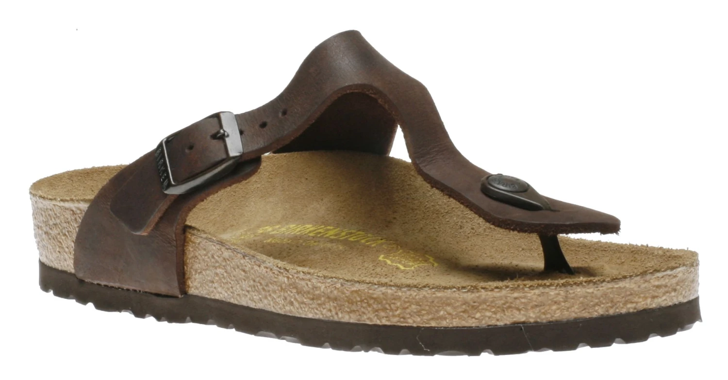 The Gizeh is a unisex sandal. The Gizeh is a thong sandal with an individually adjustable metal pin buckle. The upper is made of extra thick sturdy, oiled nubuck leather with an open-selvage finish. Oiled leather means the sandal has an untreated surface. Birkenstock purposely does not treat surface grains of its sandals.Â