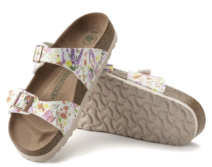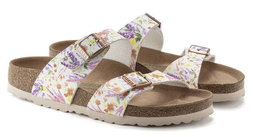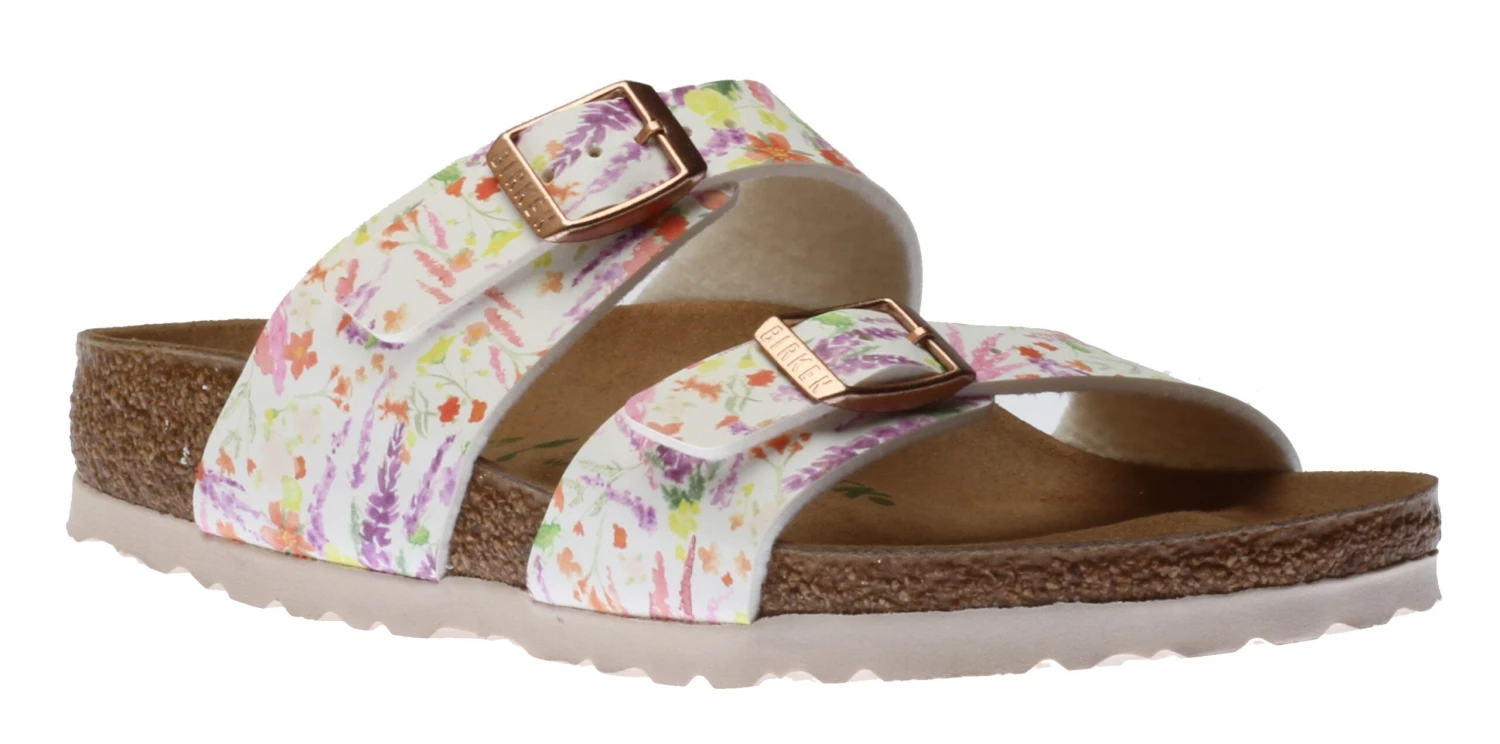 The Birkenstock Sydney two-strap slide sandal has both form and function. With its two simple straps, it covers fashion and comfort. It is made from vegan materials and includes an upper made of Birko-Flor® in a delicate watercolor flower pattern.