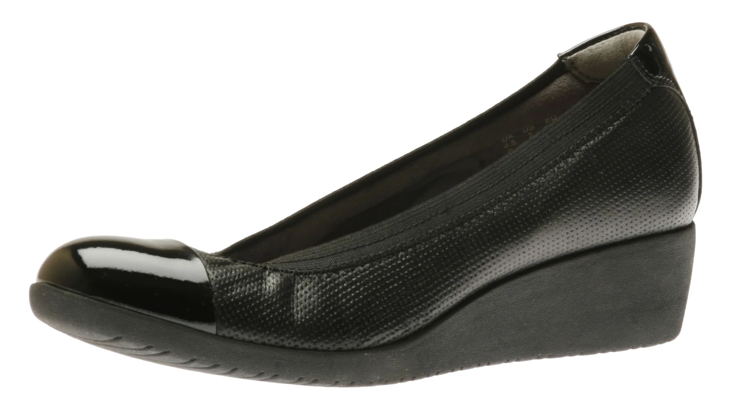 This classic wedge pump crafted from leather or nubuck is given a twist with a patent leather cap toe and heel. Inside, it features a breathable textile lining and removable Ortholite® molded footbed for enhanced cushioning. Durable EVA outsole. Heel height is 1.5 inches.