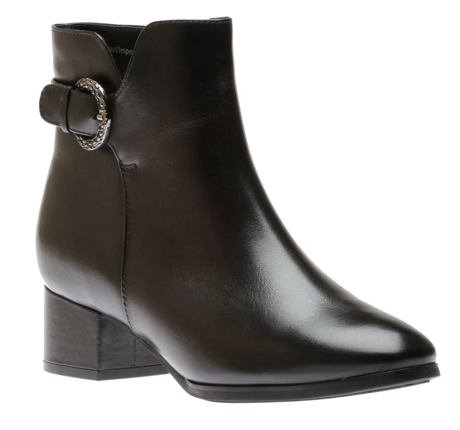 This sleek ankle bootie features a waterproof leather upper enhanced with AquaProtect® seal, a type of seam-sealed construction. This process provides superior protection against water infiltration and the harmful effects of calcium/salt for enhanced durability. A strap with metallic buckle closure at the side adds a chic touch while a block heel enhances stability. A durable rubber outsole delivers stable shock-absorbing traction.
