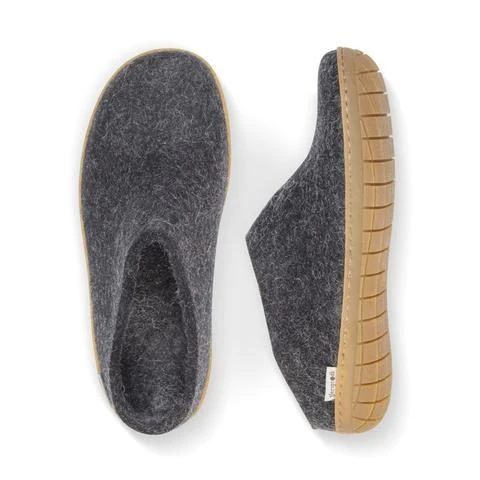 These wool charcoal shoes with a natural rubber sole are designed to envelope your feet in warm snug comfort. The Slip-On Charcoal Rubber is made of natural wool and avoids unnecessary chemicals and uses only colours that are free of heavy metals and toxic dyes. Traditional felting craftsmanship and a sole of semi-vegetable tanned calfskin allows these slippers to adjust to your foot shape after just a few uses, making them more comfortable with each wear. These shoes are best worn sockless as the wool’s breathable moisture-wicking properties ensure less perspiration and a natural odor-free environment while the unique felting process removes the itch of wool keeping feet in blissful warm comfort. Inside, a double layer felted wool insole provides cushioning and enhanced durability. A lightweight flexible leather outsole delivers secure traction and ensures no static electricity is generated when worn.