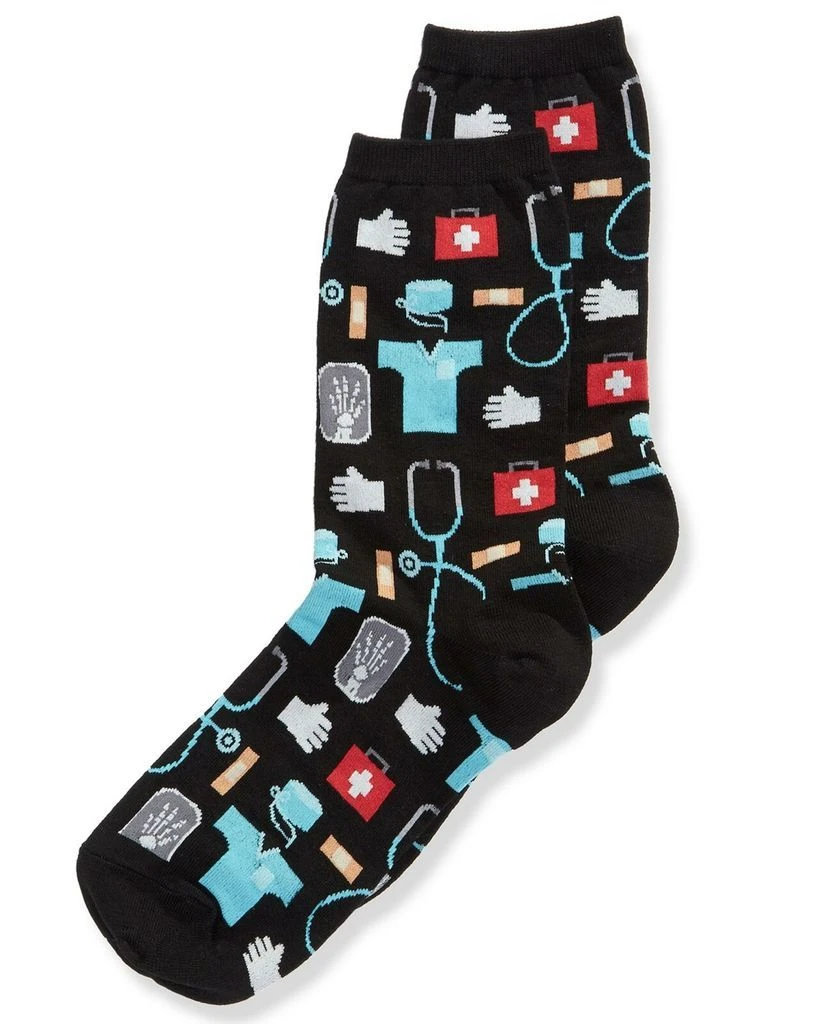 These medical-themed crew socks are perfect for nurses, doctors and medical professionals. With a pattern of scrubs, stethoscopes, X-rays and pill bottles, these fun novelty crew socks will be a favorite. This also makes a great gift for the doctors, nurses and other medical personnel that work so hard – celebrate them with these medical theme crew socks!Â