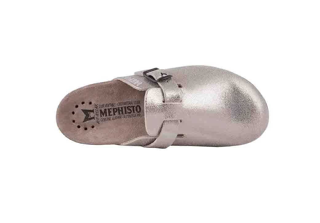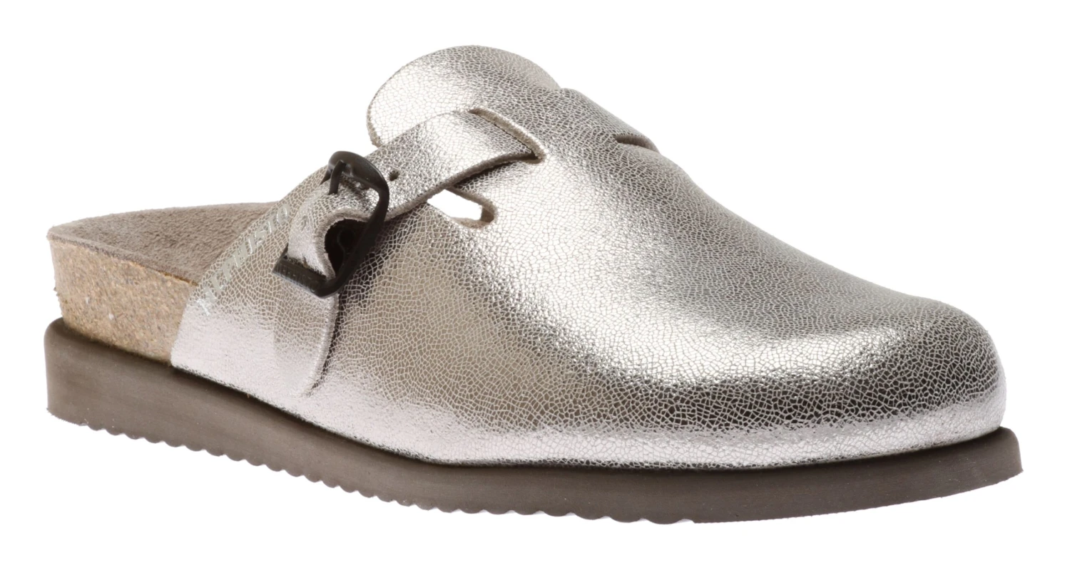 Add a touch of glamour to your everyday wardrobe with the silver Halina clog-style mule! Slip them on and run errands or wear them around the house. Ultra-comfortable with its anatomic correct footbed, cork midsole and multi-layered footbed integrated with Soft-Air Technology to reduce shock, it’s hard for any other shoe to compete. An adjustable strap with a buckle closure ensures a secure and custom fit and an EVA outsole absorbs shock and reduces stress put on your feet, legs and back. Try these Mephisto clogs and never look back!