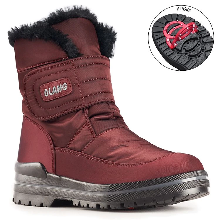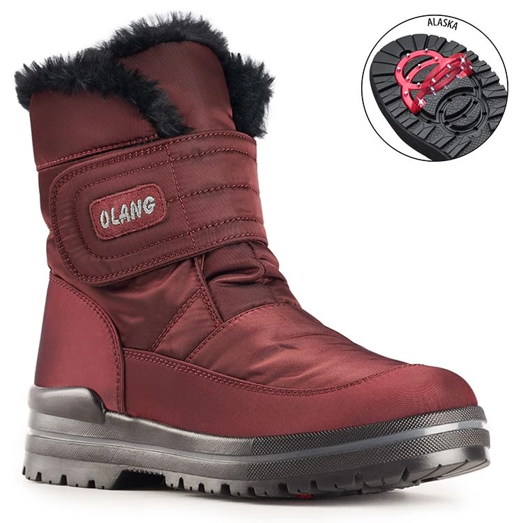 This Luna Uva cozy winter boot is crafted from quality Italian craftsmanship to deliver superior comfort and warmth. It features an adjustable front strap with Velcro closure for an easy on-and-off and a BREATHTEX waterproof membrane to ensure a dry fit. A breathable insulating OLANTEX film lining and an ISOWARM insole made of 90% wool with insulating and reflective silver foil keep feet in warm cushioned comfort. A blend of wool, polyester and imitation fur enhances warmth and breathability. An Italian sole is reinforced at the bottom of the rod for heel and toes. It features 16 stainless steel spikes, built-in swiveling and folding OC System® with flow channel to deliver secure non-slip grip and traction.