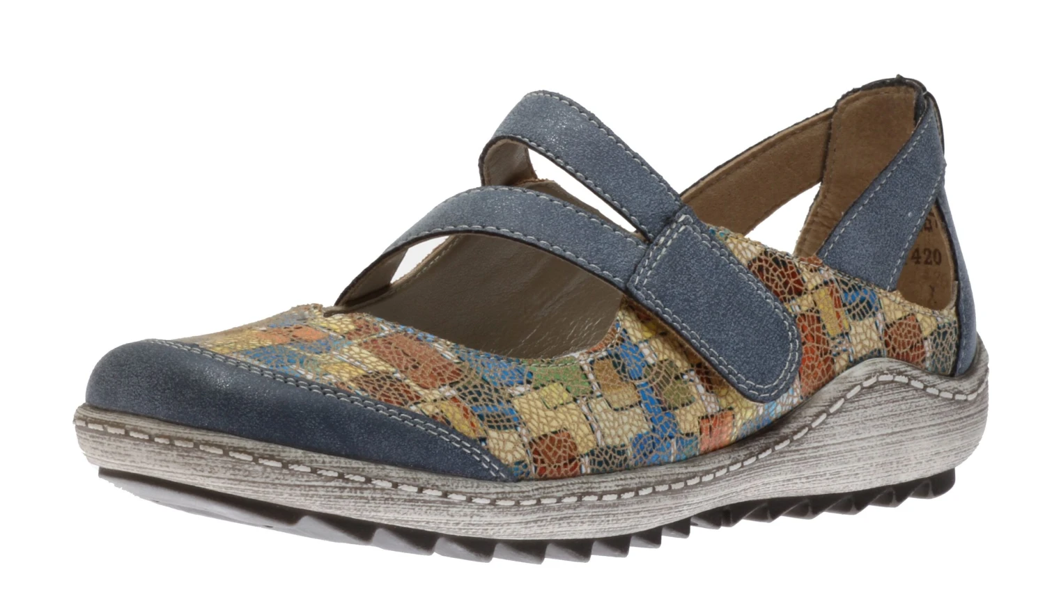 The Odense is a funky, retro-inspired mary jane flat shoe that features a grey sole, solid panels of blue at the toe, heel and straps and a playful patchwork of colours and squares on the rest of the shoe as if the design were inspired by Scandinavian art. The two straps across the foot and at the heel adjust and fasten with a Velcro closure. You’ll love these mary jane flats because they will be the perfect last detail to many of your spring and summer outfits.